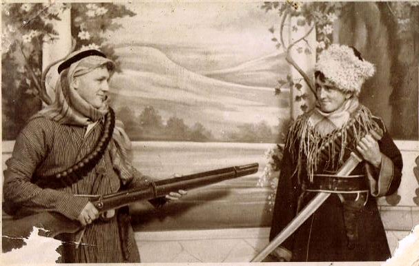 Above (row of 3 photos), Bobby poses with proud Dad and Mum. It is devestating to think that once Bobby sailed for the Middle East, he did not see his father again. The lower photo was posed in the Holy Land (probably at Mr Feigenbaum's worthy establishment) as a jest -- a postcard to send home and enthrall the rellies. Bobby portrays an Aghan brigand on the right. Just as an aside, Mum was visited by a policeman during the early 1940's and almost fainted. "Oh! I have 2 sons fighting in the War", she gasped, thinking that this uniformed man was the harbinger of bad news. "No, lady, I'm only here to check on one of the neighbours who's been burgled!" |