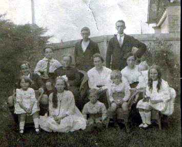 Back: Alan Logan, Ern, Dad. Middle: Ron, Grandma Atkinson (seated in cane chair), Ada, Mum (with Les on her knee). Front: Eunice Logan, Dorothy, Syd, Len (in the small cane chair) and Elsie. |
