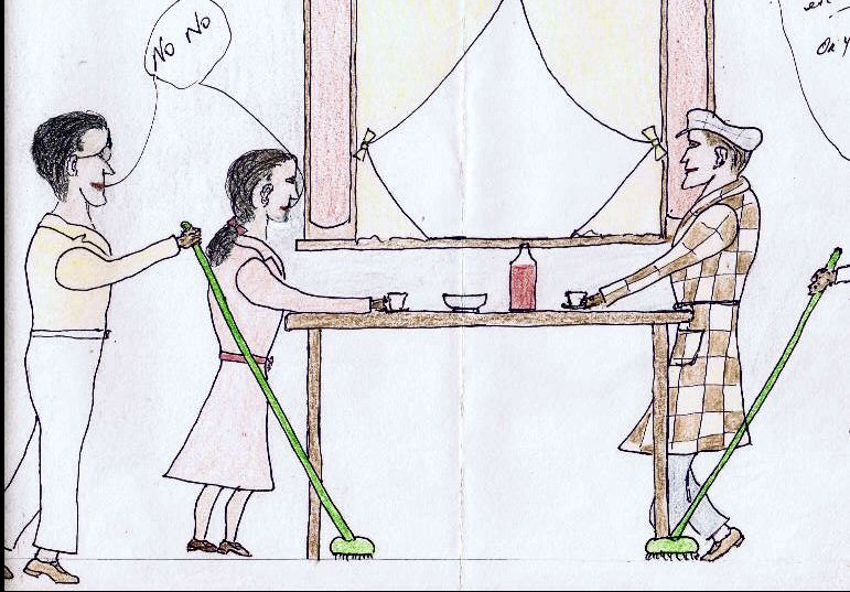 ![]() Then clearing away the dishes and sweeping the floor. Ron (off to the right out of shot) is as ever cheerily singing in his lovely baritone voice. "Like a stone from a strong catapult I rushed at my terrible cult etc etc ... Or you'll be as ugly as I'm". To which Els and Boz reply: "No! No!" |