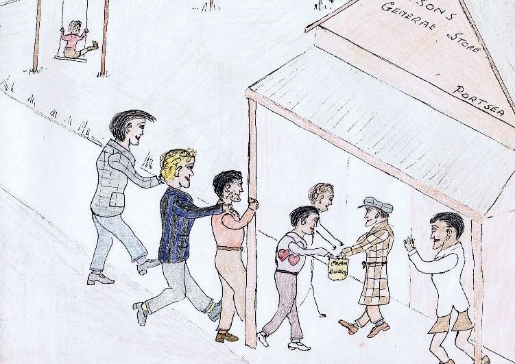 ![]() A welcome break after a long walk from Sorrento to London Bridge along the back beach. At Watson's General Store, Portsea the Reeds and Stan dive into a bag of cream biscuits, held by Ern. |