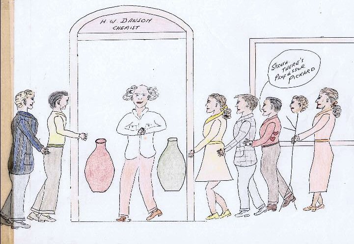 ![]() The Reeds descend upon H. W. Dawson Chemist. Bobby blurts out: "Struth! There's Professor Pickard". The eminent Swiss physicist Auguste Pickard had a similarly eccentric hairdo. |